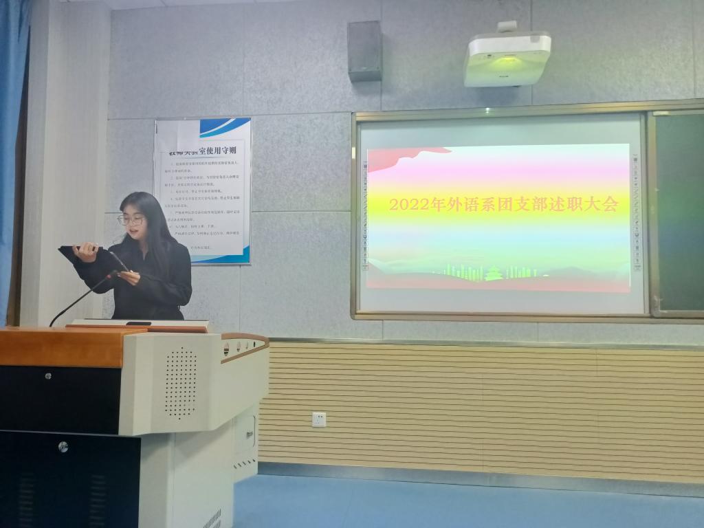 为贯彻落实全面从严治团要求,进一步加强我院基层团组织建设和团干部队伍建设,检验外语系各团支部2022年基层团务工作的开展情况,外语系于3月28日在教学楼B304开展2022年团支部书记述职评议大会。参加本次会议的有外语系学生工作负责人吴丹,外语系团工委书记韩蓉,外语系团工委副书记孟叶及各团支部书记。