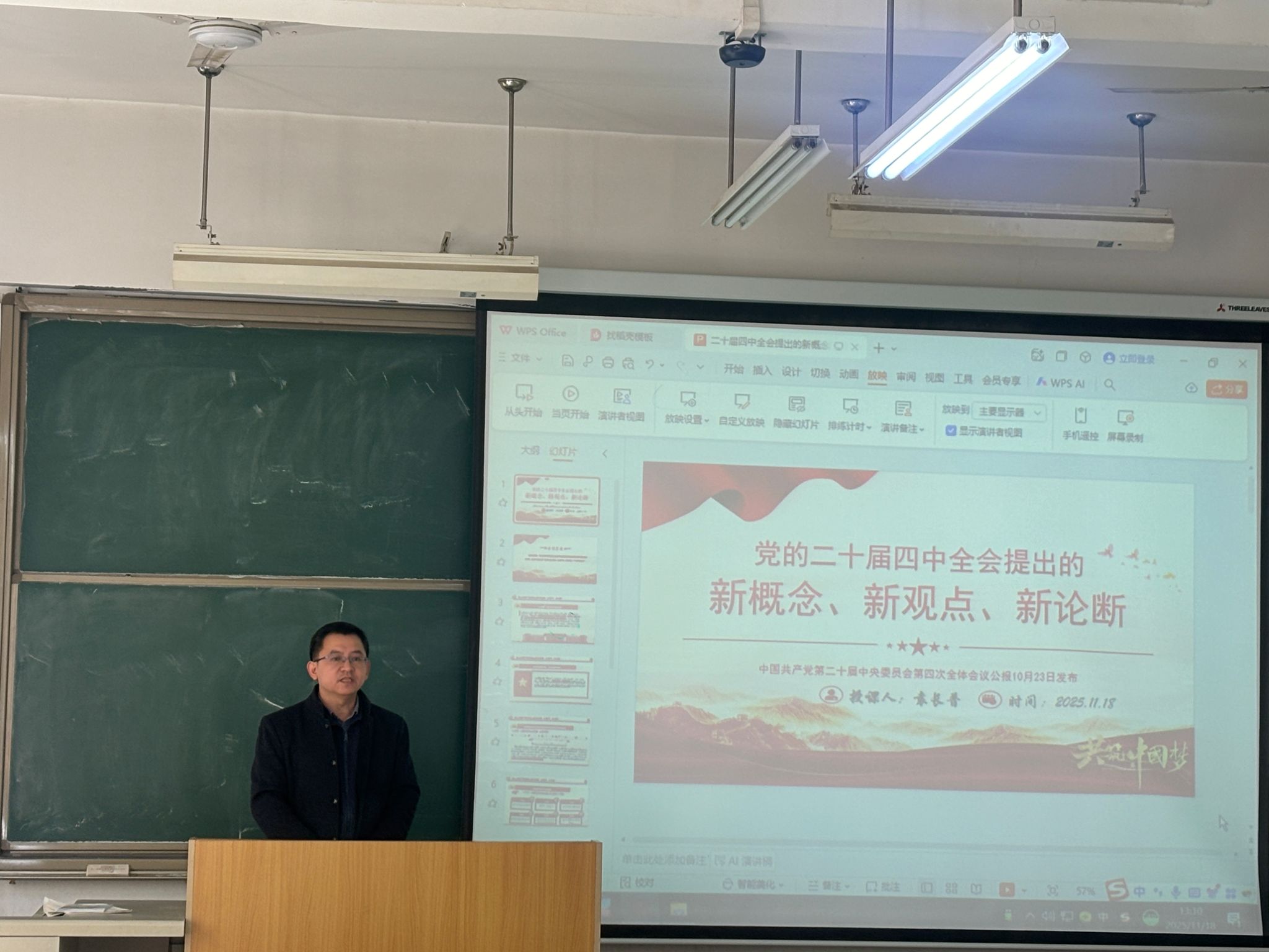 11月18日下午,传媒与外国语学院教工第一党支部与学生党支部在教A315联合开展支部共建活动。教工第一党支部书记袁长普以“党的二十届四中全会提出的新概念新观点新论断”为主题,为师生党员带来一堂内容丰富、思想深刻的专题党课。