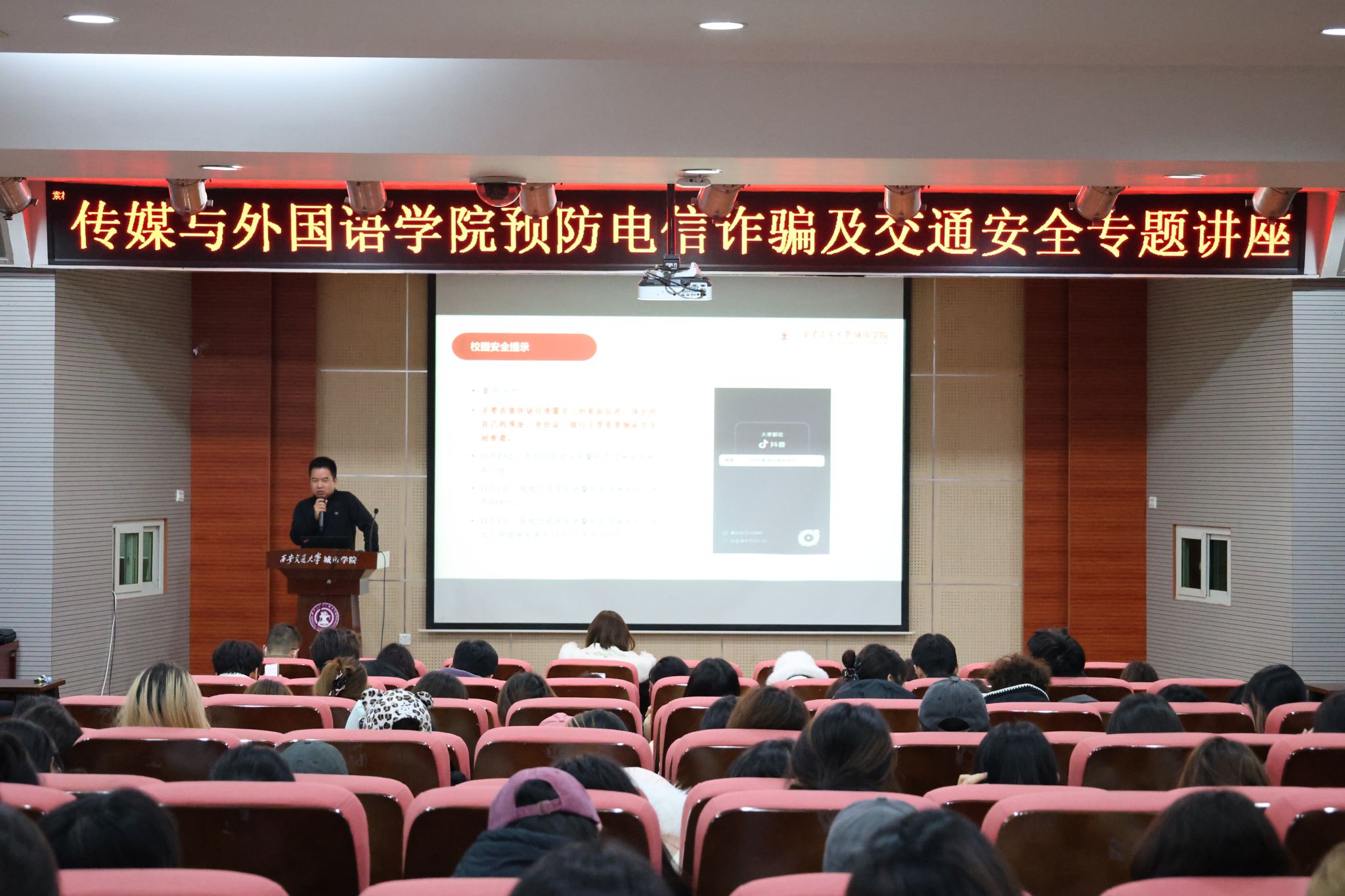 为增强学生的安全防范意识、掌握必要的防护技能,传媒与外国语学院于12月3日在F100报告厅开展预防电信诈骗及交通安全专题讲座。保卫处冯西军、魏佳庚、辅导员杨月及2025级全体学生参与本次讲座。